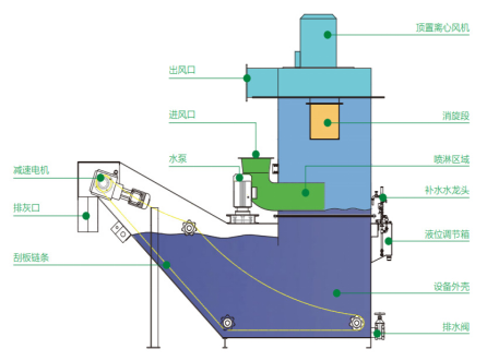 1、自動水循環系統,定時清理沉淀水池底部淤泥,保持水潔凈,提高除塵效率。
