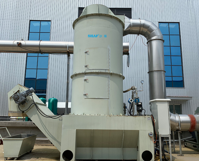 除塵系統(tǒng)運(yùn)行中,收集罩把粉塵產(chǎn)生源將煙塵/粉塵捕集起來,通過管道系統(tǒng)輸送到分離器的進(jìn)風(fēng)口,之后進(jìn)入噴淋區(qū)域,在最近的位置通過氣